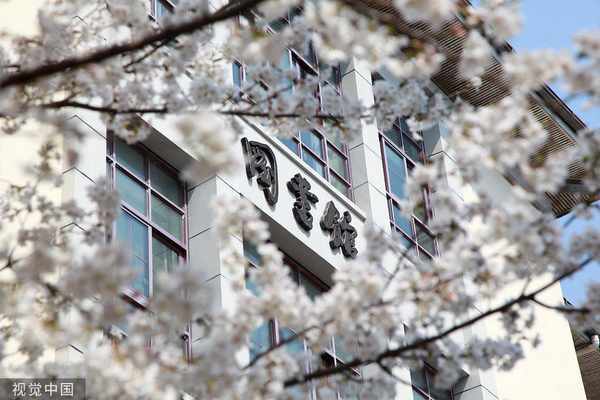 2023年3月15日,南京林业大学校园内的樱花绽放。图书馆。