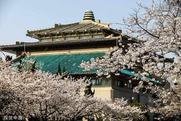 2023年3月15日,武汉大学的樱花与建筑交相辉映。