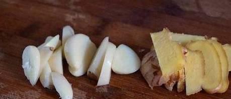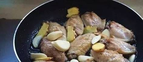 5、直至煎至鸡翅的两面金黄色,这时加入蒜片和姜片;