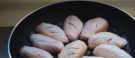 4、冷锅冷油,待油烧热后把鸡翅码上锅,保持中火煎煮;