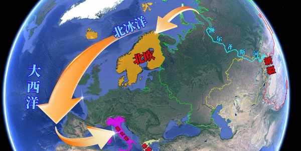 但是从地图上我们可以看出来,从额尔齐斯河出海经鄂毕湾进入北冰洋之后,去往北欧确实比较方便,但是去往意大利、希腊等南欧地方还需要绕一个大圈,里程同样不短。