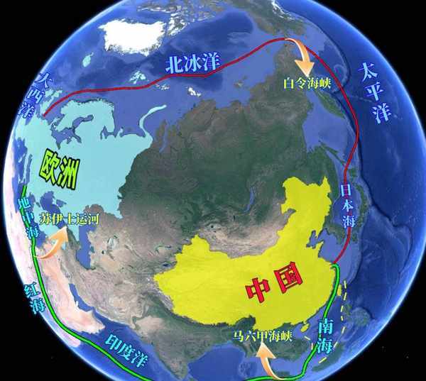 除了传统的国外洋航线之外,随着全球变暖,绕行北冰洋的北极航线也变得可能。北极航线从我国沿海出发,穿越国外海进入太平洋北上,穿过白令海峡进入北冰洋,之后沿国外海岸线一路往西达到北欧,进入大西洋,从而去往欧洲各国。走这条航线,可以避开马六甲,缺点也很明显,一是路程同样非常漫长,也在10000到20000公里之间,二是北极航线还不时尚,夏天需要破冰船维护航线的正常运行,春季结冰期很长,几乎无法通行。