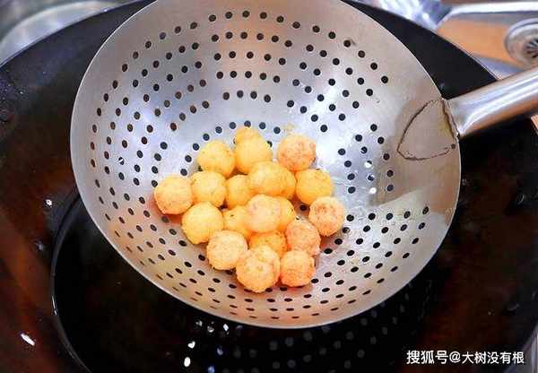 4.锅内烧油,油温五成热时下入团好的萝卜丸子,开小火慢慢炸至丸子定型,丸子炸酥、炸成金黄色时夹出来控油。