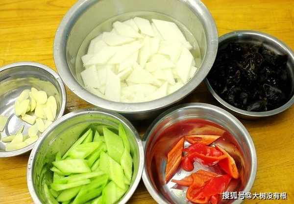 1.削山药的时候最好带上手套,以免皮肤过敏,削好以后切成片立马放清水里泡上,省的氧化变黑,再切点黄瓜片、红椒片;提前泡发的木耳,把硬根摘掉撕成小朵。