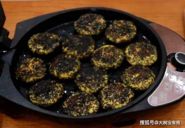 5.电饼铛预热3分钟,均匀刷上植物油,把做好的生坯放入锅中,盖上锅盖烙2分钟,2分钟以后在饼皮上均匀淋上植物油,锁住饼内部的水分防止烙糊,把饼翻一下面再烙三分钟,饼两面都呈金黄色时即可出锅。