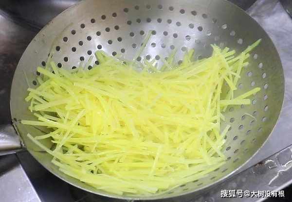 3.把土豆丝沥干水分,放入沸水中焯一下水,大约汆水20秒钟,土豆丝变色以后立即倒出,用清水冲洗降温,保持脆嫩的口感。