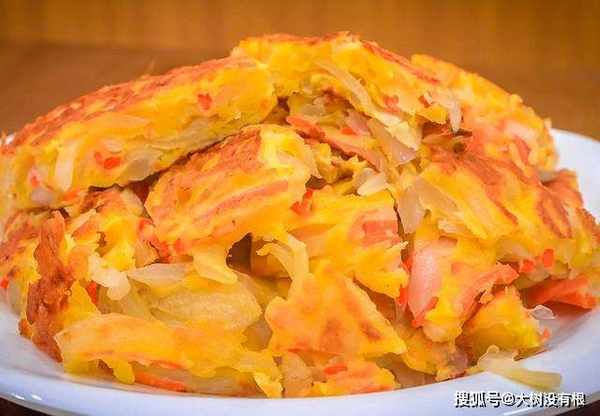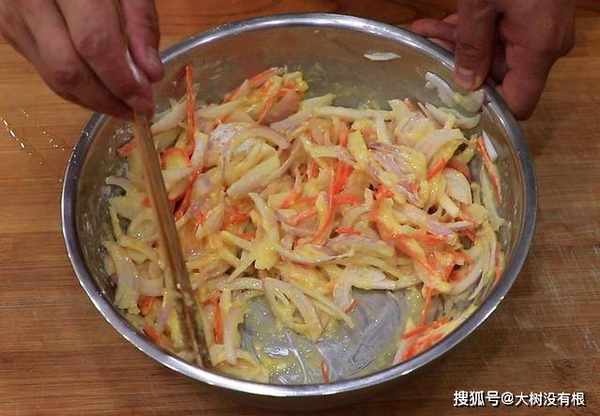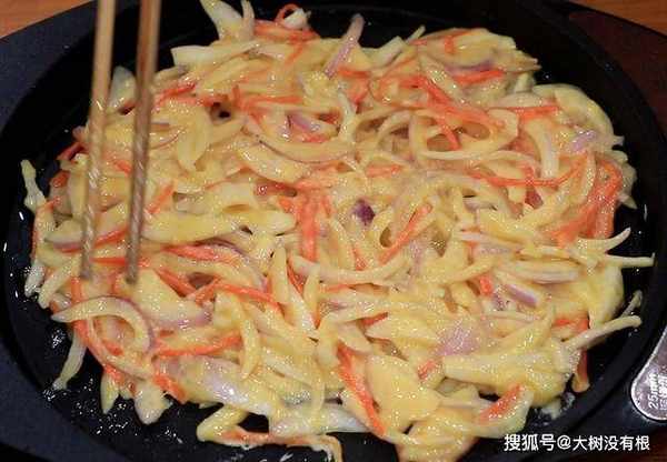 1.准备洗净的小洋葱三个,切成细丝;胡萝卜半根也切成细丝,放在同一个盆中,打入3个鸡蛋,鸡蛋能使烙出的饼更加软嫩,加入食盐2克,鸡粉2克,加入面粉50克,搅拌至馅料成团即可,面粉不要放太多,以免影响口感。