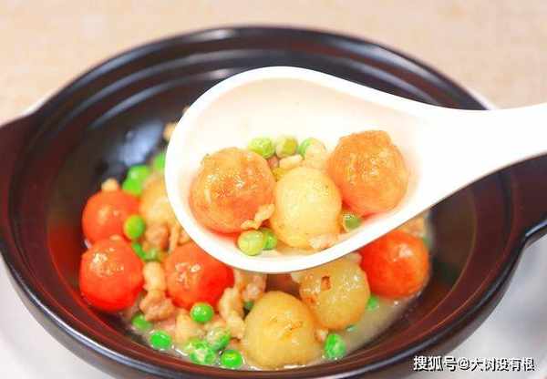 5.锅内留底油,倒入肉粒和姜末,开中火煸出里面的肥油,闻到肉香味后倒入青豆翻炒几下,加入适量的清水,开大火把青豆煮熟,加入鸡精2克,食盐2克,放入丸子转小火煨一会儿,汤汁即将收干时即可出锅,这道外酥里软的萝卜丸子就做好了。