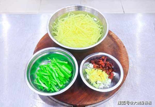 2.换水泡上,加入一点白醋,防止土豆丝氧化变色;青椒去除蒂和籽切成细丝,大葱破开切成葱花,生姜切成菱形片,放在一起再抓入一小把干辣椒。
