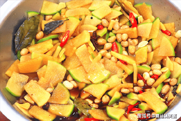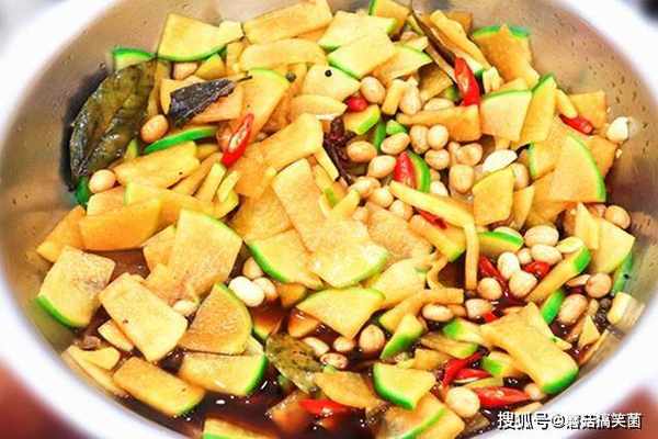 然后把萝卜片放入盆中,加入姜蒜片、小米椒、花生米抓拌均匀,倒入晾凉的腌料,用保鲜膜盖住,密封腌制2个小时就能食用。