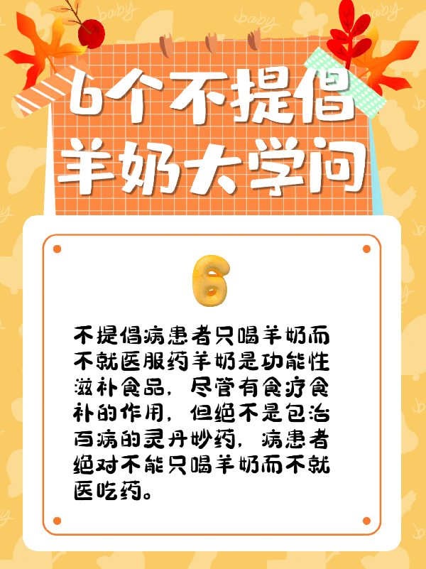 6.不提倡病患者只喝羊奶而不就医服药羊奶是功能性滋补食品,尽管有食疗食补的作用,但绝不是包治百病的灵丹妙药,病患者不能只喝羊奶而不就医吃药。