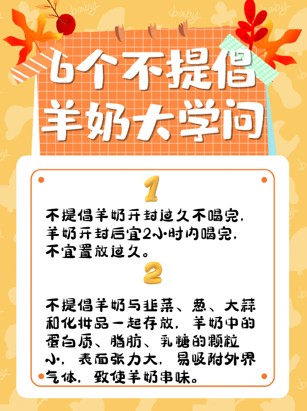 1.不提倡羊奶开封过久不喝完,羊奶开封后宜2小时内喝完,不宜置放过久。 2.不提倡羊奶与韭菜、葱、大蒜和化妆品一起存放,羊奶中的蛋白质、脂肪、乳糖的颗粒小,表面张力大,易吸附外界气体,致使羊奶串味。