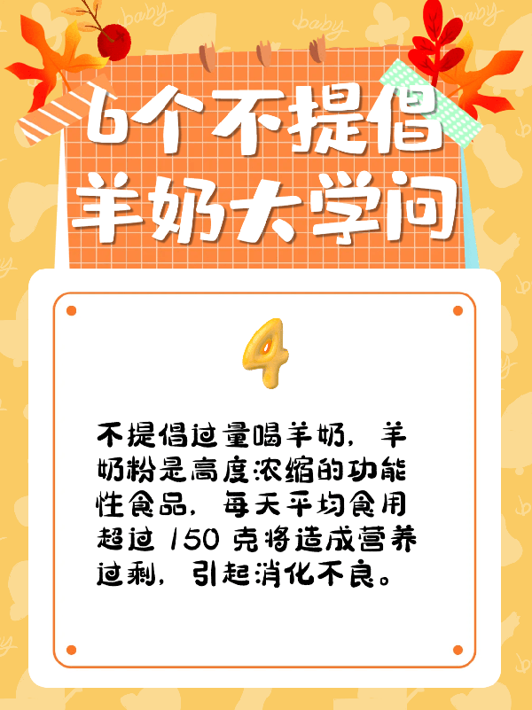 4.不提倡过量喝羊奶羊奶粉是高度浓缩的功能性食品,每天平均食用超过 150 克将造成营养过剩,引起消化问题。
