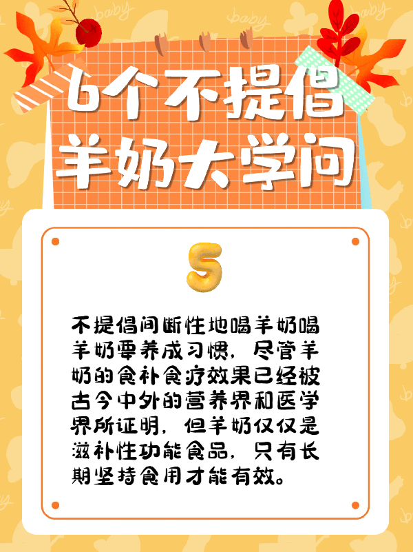 5.不提倡间断性地喝羊奶喝羊奶要养成习惯,尽管羊奶的食补效果已经被古今中外的营养界和医学界所证明,但羊奶仅仅是滋补性食品,只有长期坚持食用才能有效。