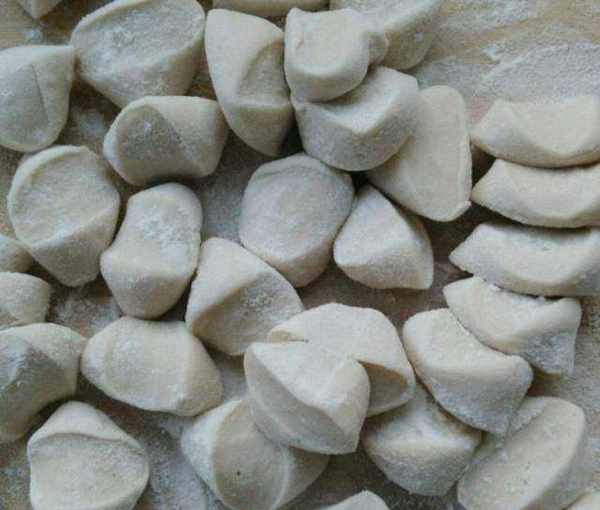 第五步:切成小块,擀成圆形的饺子皮,在饺子皮中间放上适量的馅料,揉紧,包成一个饺子。