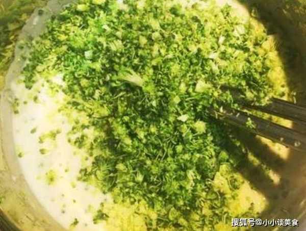 第四步:在蛋液中加入适量的盐和水,搅拌均匀,继续倒入西兰花和面粉,搅拌均匀成面团。