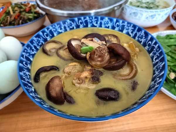 江西这边很少人养鸡鸭,所以过年的时候,土鸡土鸭卖得特别贵,一只土鸡就得两三百块钱。这种土鸡,只要简单焯水,剁成小块放入砂锅中,一次性倒入足够的清水,中火炖60分钟,再放入泡发好的香菇,继续炖30分钟左右,加入少许盐调味就可以了,这样炖出来的鸡汤,鲜香开胃,好喝又营养。