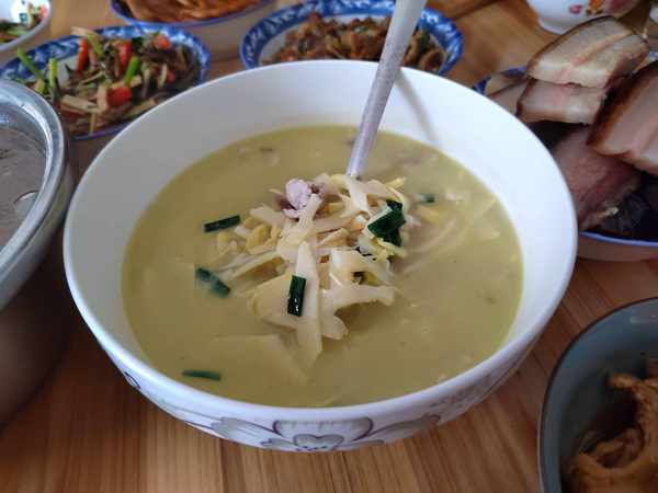 这桌菜最珍贵的不是土鸡,也不是土猪肉,而是这道“野味”。之所以说它最珍贵,是因为有钱也很难买到。棕芯,是棕树顶端的嫩芯,取棕芯要把棕树砍下来,这样棕树就不能存活了。而且一颗棕树上,取得的棕芯并不多,所以尤其珍贵。棕芯脆嫩可口,用来煮瘦肉汤,或者炒腊肉都很美味。