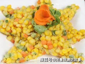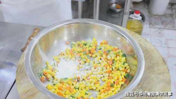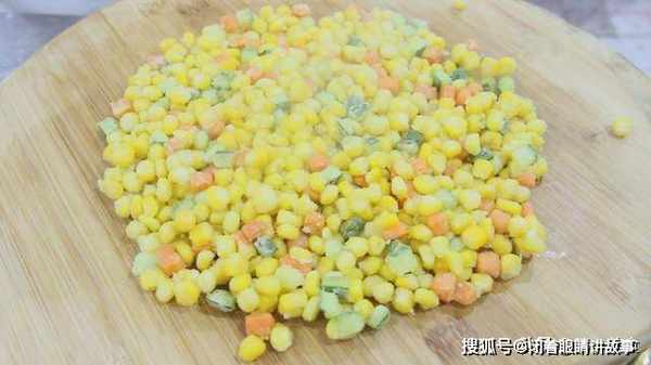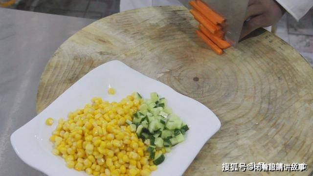 1.准备两把玉米粒,黄瓜半个,胡萝卜一小段,把黄瓜和胡萝卜都切成玉米粒般大小。