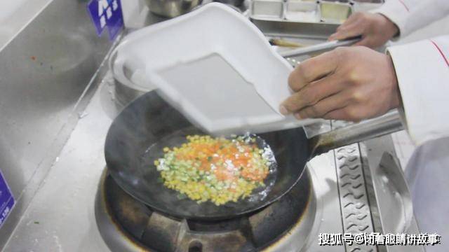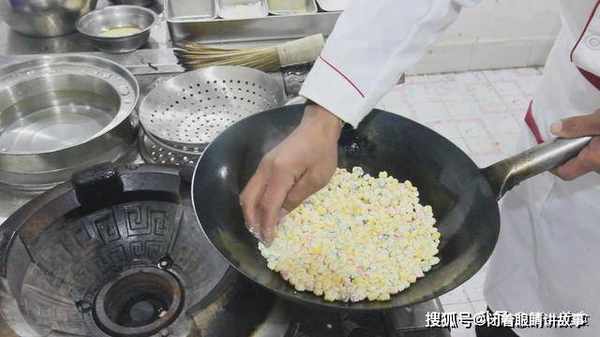 5.开小火,用勺子轻轻地按压玉米粒,让它粘在一起。