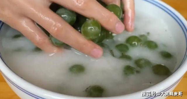 2. 将葡萄一颗颗剪入碗中,加入没过葡萄的清水,再加一勺食盐,一勺面粉,搅拌均匀。食盐具有消毒杀菌的作用,而面粉具有很强的吸附性,能将表面的脏东西全部吸干净。