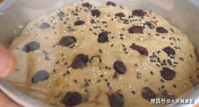 13. 将调好的面糊倒入烤盘中,平铺整齐,再在表面撒一层黑白芝麻,点缀几颗蔓越莓干。
