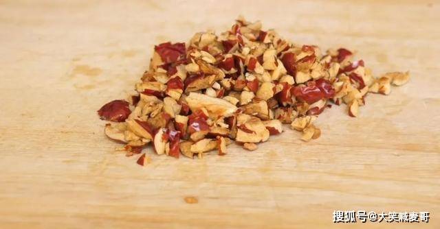 9. 红枣洗净后,剪成一条条,中间的枣核去掉不要,全部剪好用刀切成红枣碎备用。