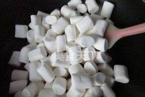 7、黄油完全融化后放入棉花糖,继续中小火加热,并不断翻动,让棉花糖均匀受热。