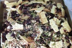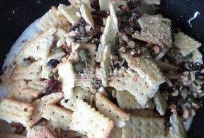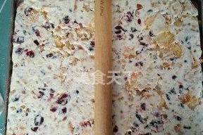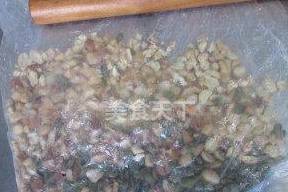 5、蔓越莓干切碎丁,把果干、果仁和饼干混合均匀备用。