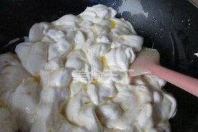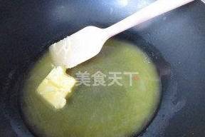 6、用不粘锅,中小火加热把黄油融化。一定要用不粘锅,这样食材不会沾到锅壁上,翻拌最后是用硅胶铲,这种铲子不会沾。