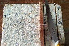 16、晾凉后用学厨的三件套配套尺竿比着,用关东锯齿刀切条后再切块。