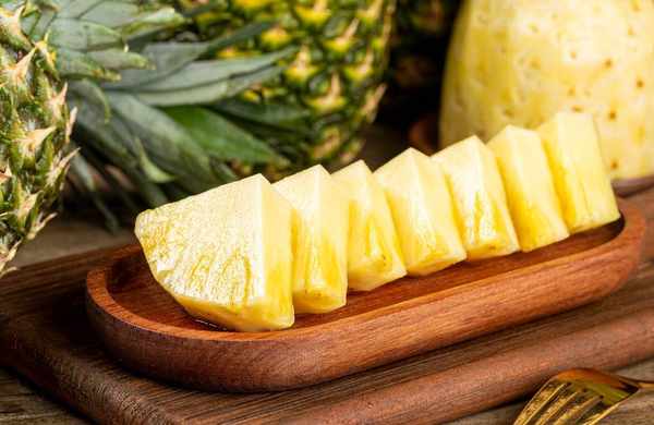 现在正好是吃菠萝的季节。菠萝酸甜可口,有“黄金果”的美誉。它富含的维生素B、维生素C、钙质以及磷等物质,可以帮助消化、清除疲劳、增进食欲。在中医上菠萝性味甘凉,具有生津解渴、消食健胃的功效。