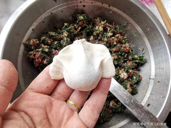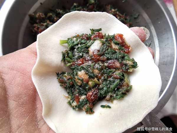 第六步:面团拿出揉匀,搓成长条,揪成小剂子按扁,用擀面杖擀成饺子皮,放上适量的馅料。