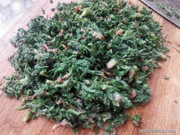 第四步:烫好的白蒿捏去多余的水分,用刀剁碎备用。