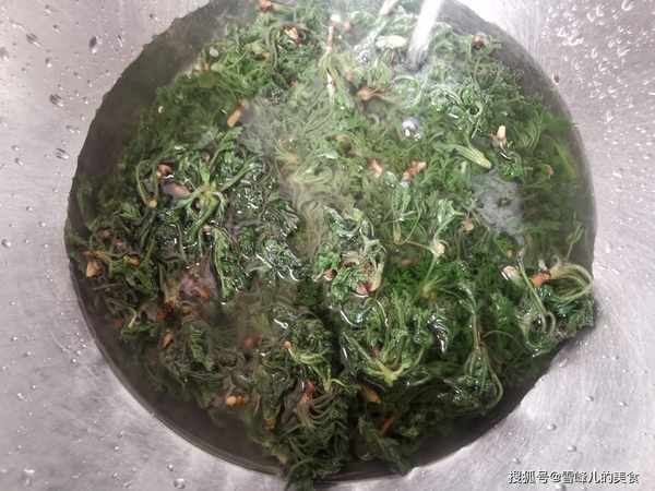 第三步:白蒿做馅,我们先把洗净的白蒿放入开水中汆烫,捞出放入冷水中过凉。