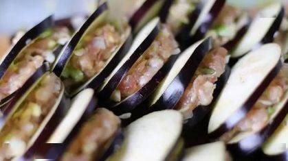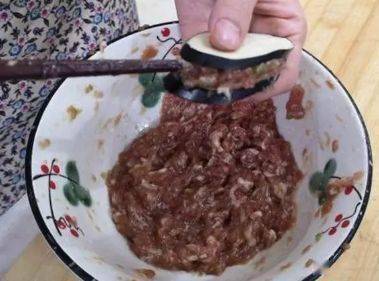 取一个茄子片,把肉馅夹在茄子中间,不要夹太多,以免炸的时候肉馅外漏,直接导致炸茄盒失败。虽然说肉馅夹的多口感香,但不是每个人都能掌握好的,特别是第一次做炸茄盒,肉馅能少不要多了,这样成功率比较高。