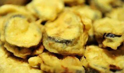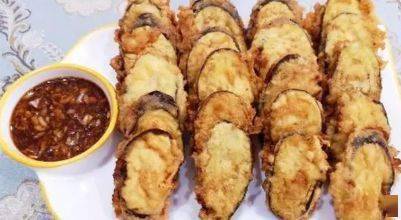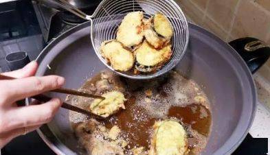 锅内倒入多一些的油,油温烧至5成热,转成小火,把茄盒裹满面糊放入锅中,中间用筷子翻动下,让茄盒受热均匀,炸至两面金黄控油捞出。炸茄盒一定要用小火慢炸,大火炸茄子熟透了肉还没熟,等肉熟了茄子自然就糊了,多数炸糊了就是火候和面糊没调好的原因。