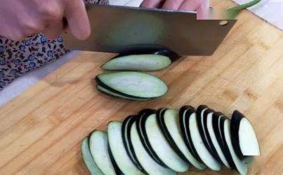 买茄子的时候要选大小均匀的,茄子清洗干净控干水分,切成厚片,一刀不要切到底,一刀切到底,根据这个刀法把所有茄子全部切完备用。需要注意的是厚薄度要均匀,切得太厚不容易熟,太薄了容易炸糊,切茄子也很关键的。