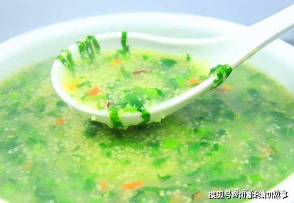 大约熬制3分钟,小米开花以后把芥兰倒入锅中搅拌均匀,继续煮至小米微微烧开,勾入半勺芡粉,把小米粥调得稠一点,以免过于寡淡,用勺子快速搅匀,小米粥再次煮开以即可装出锅,一道营养清淡的青菜小米粥就做好了。