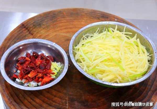 准备两个土豆,把外皮刮干净,先切成均匀薄片再切成细丝,切好以后用清水泡上,以免氧化变黑,