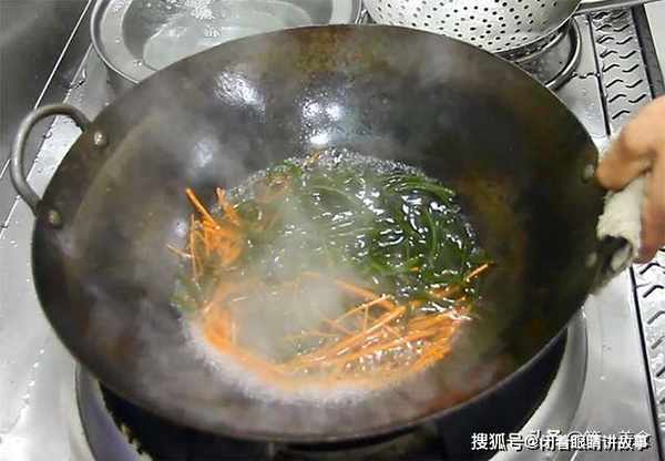 锅里烧水,水开后倒入胡萝卜丝和海带丝,焯水30秒后捞出快速用清水冲洗,海带丝焯水能减少海带的腥味,清水冲洗胡萝卜丝吃起来口感会更脆,沥干水分后备用。