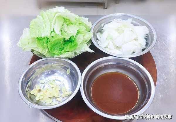 准备一棵白菜,把白菜叶分开放入清水中洗干净,把菜叶和菜帮分开,菜叶切成大块,菜帮斜刀切成片备用。