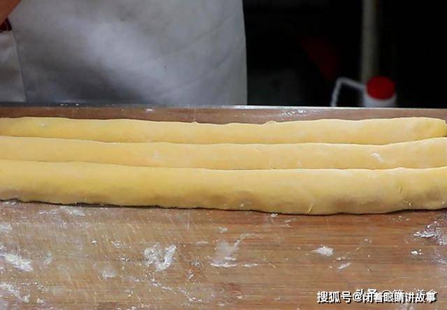 1个小时以后面团已经发酵至2倍大,内部都是蜂窝眼说明已经发酵好了,把面团取出多揉一会儿排出里面的空气,把面团整理成长条,擀成半厘米厚的长方形的面饼,在面饼上涂一层清水增加粘性,把面饼分成三份,卷成相同的长条。