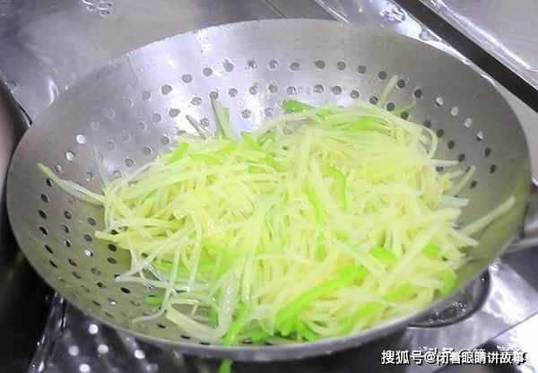 锅内烧水,水烧开以后把土豆倒入锅中快速焯水20秒钟,土豆表面有些透亮时倒出来,用清水冲洗几下,以免土豆丝回软,口感不够清脆。
