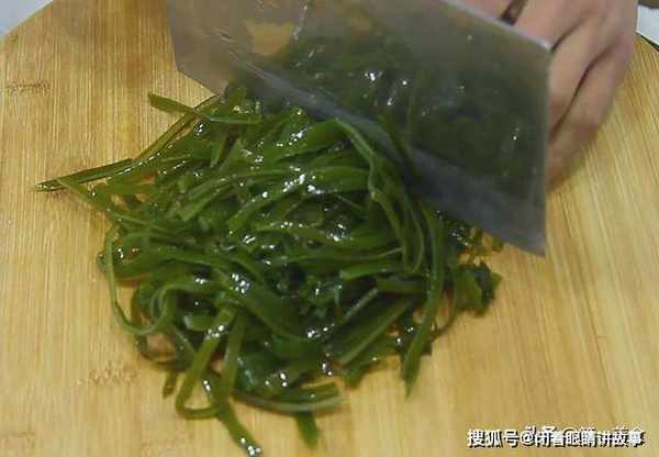 准备海带丝一把,洗净后切上几刀,装入盘中备用。