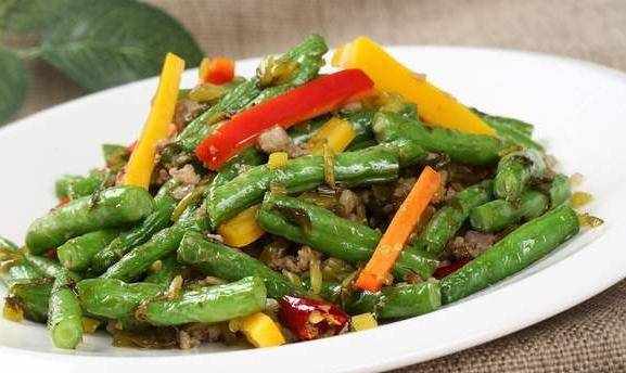 然后倒入适量生抽或生抽炒匀上色,再倒入加工好的豆角拌匀。待香气散去后,加入适量的盐,继续翻炒一两分钟。豆子会煮熟,味道鲜美,就可以上菜了。关火上桌。