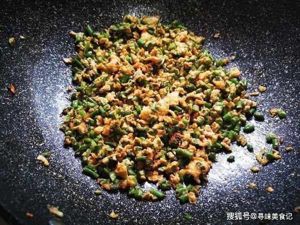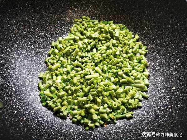 5、接着倒入我们切好的豆角粒翻炒,一直翻炒到豆角,七八成成熟。