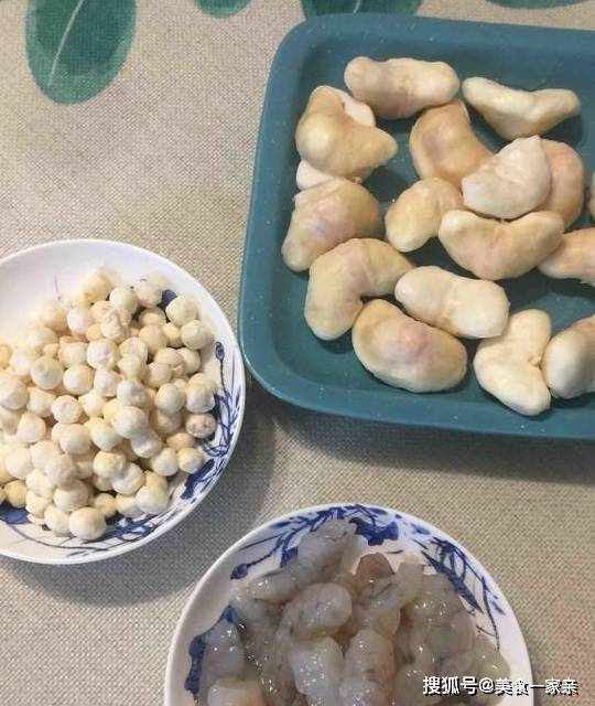 1.鲜水红菱去壳,菱肉洗净备用;虾仁加盐料酒淀粉腌制片刻;鸡头米自然解冻