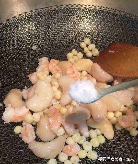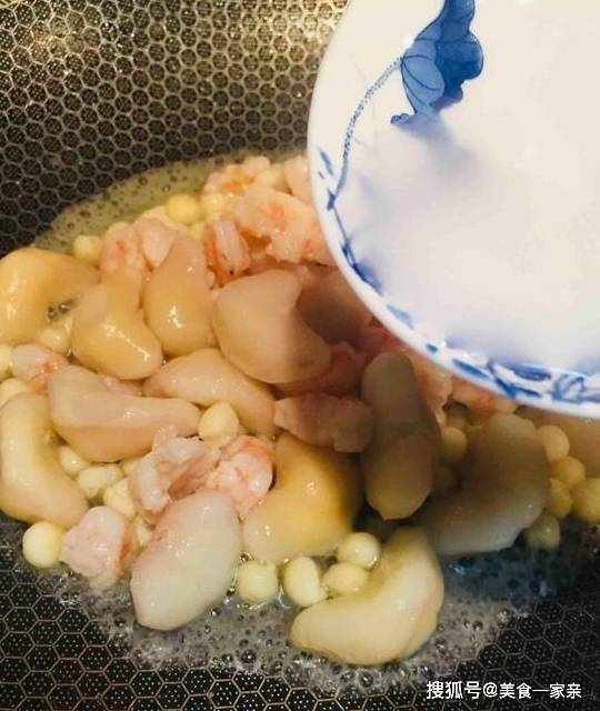 6.热锅热油,放入红菱肉、鸡头米,虾仁翻炒均匀,加适量盐、少许高汤翻炒片刻,