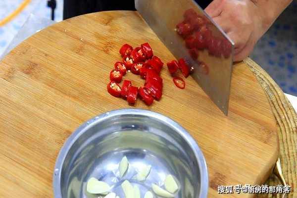 大蒜几粒切成片,红线椒几粒切成辣椒圈备用。